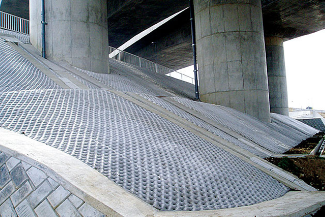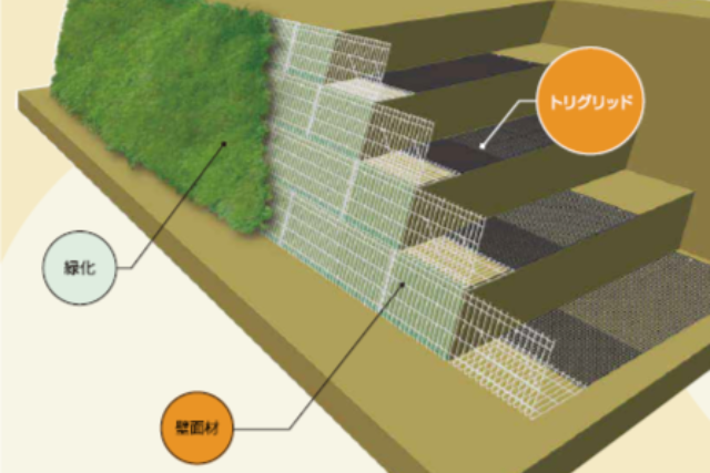 高密度ポリエステル繊維を束ねたものを芯材とし、格子構造状に構成したものです。土との一体性に優れ、急勾配の盛土や長大斜面などを経済的かつ容易に施工することが可能です。
