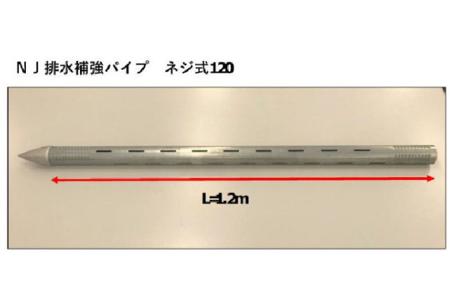 ストレーナ加工された鋼製の直径約6 ㎝の排水補強パイプを斜面に打設することにより、排水パイプとしての機能に加え、地山補強を併せ持つ工法です。