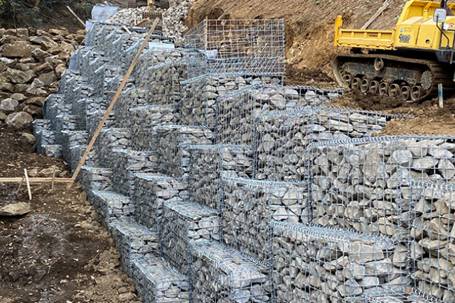 高密度ポリエチレン樹脂の部材をハニカム状に広げセル(枠)内に現場発生土や砕石を充填、段積みすることにより擁壁構造体を構築して切土法面を保護します。