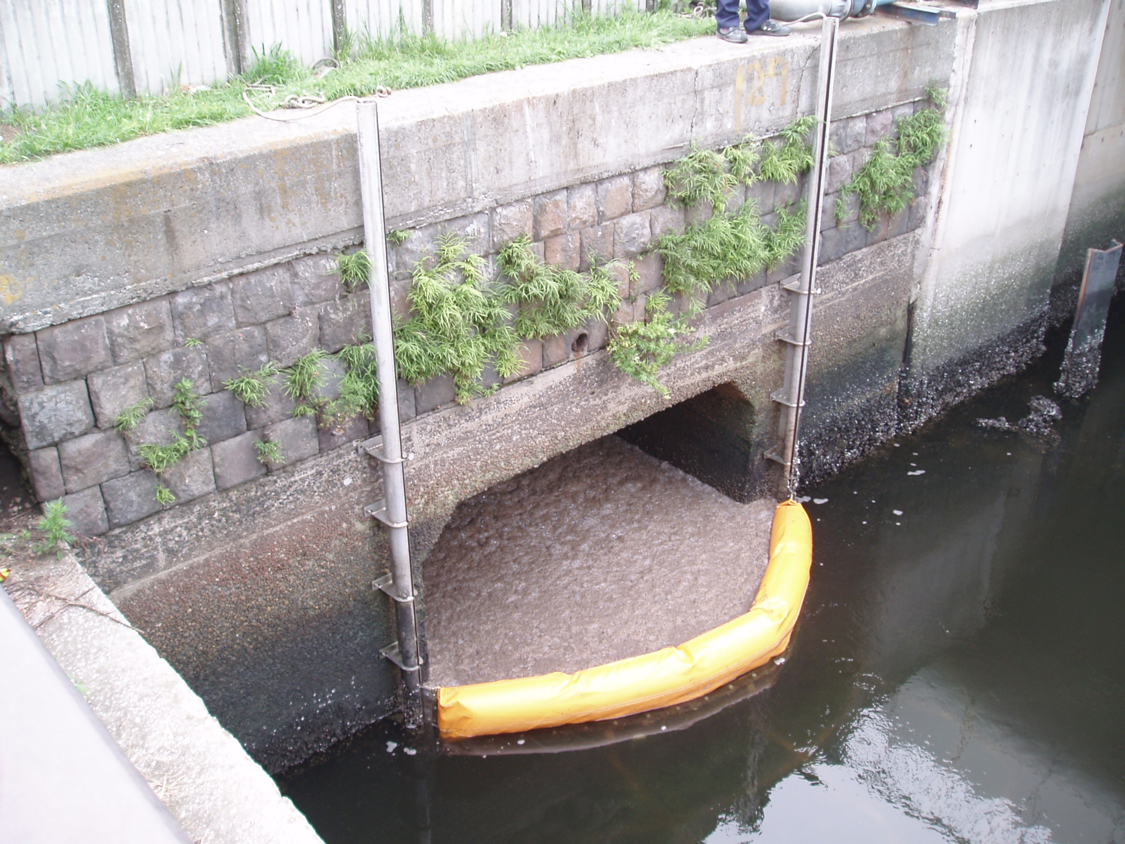 下水道の吐口に設置して、油のかたまりの流出を防止します。